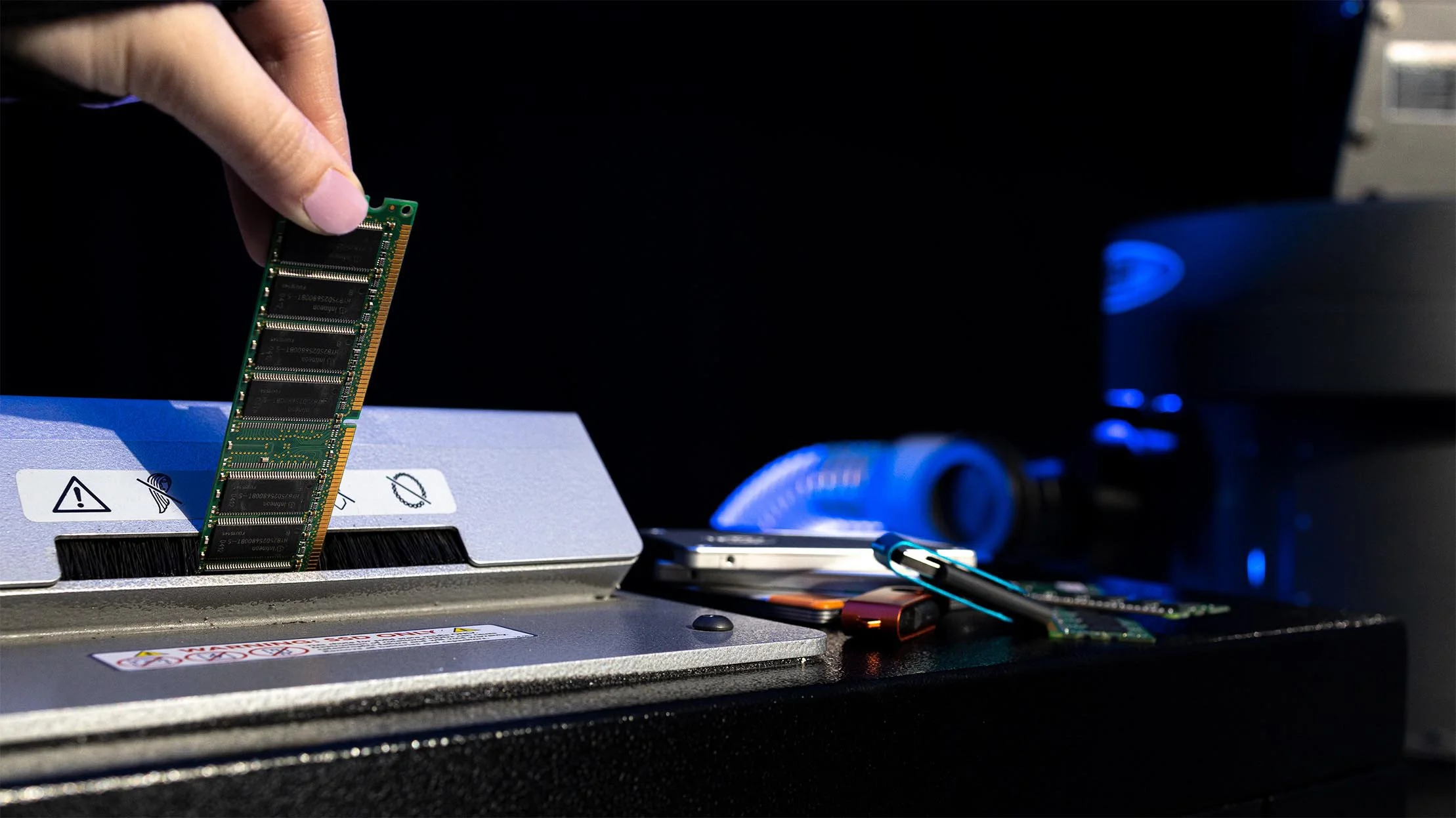 Equipment for the physical destruction of hard drives, solid state drive and magnetic media.